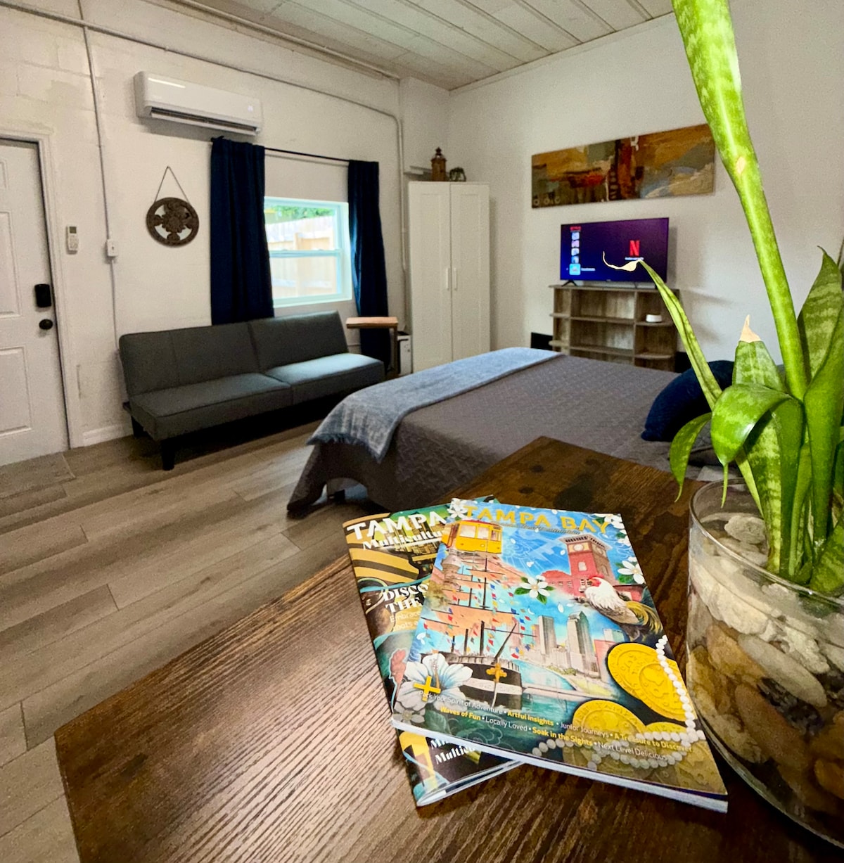 在這個設計時尚又安靜的新空間中好好放鬆身心。 空間:獨立入口,可自助入住的 1 間臥室單間公寓。房源提供1張雙人床、獨立浴室(配有步入式淋浴間)、吹風機、毛巾、沙灘毛巾、衣櫃、智慧電視、WiFi和前門廊。現代化廚房,備有冰箱、微波爐、烤麵包機、迷你爐具和銀器。 區域:單間公寓距離柑橘公園購物中心 10 分鐘路程,距離坦帕國際機場 13 分鐘路程,靠近布希花園和坦帕灣區域