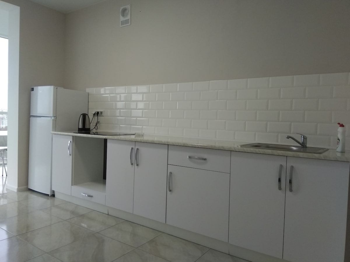 全新現代化建築中的公寓景觀。人行道是一間舒適的臥室,配有內置衣櫃、空調和電視。配有全景窗戶的廚房,並配有沙發供您放鬆身心。 有一個可供吸煙的陽臺。公寓配備舒適住宿所需的一切物品、洗衣機、熨衣女兒、牀單烘乾機、吹風機。即使在夜間,也可以隨時入住。與寵物一起順利入住。有超市,交通方便