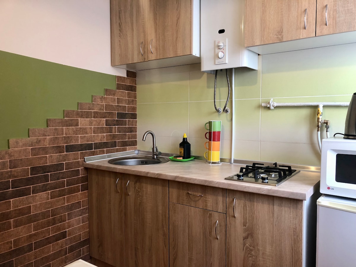 全新現代化建築中的公寓景觀。人行道是一間舒適的臥室,配有內置衣櫃、空調和電視。配有全景窗戶的廚房,並配有沙發供您放鬆身心。 有一個可供吸煙的陽臺。公寓配備舒適住宿所需的一切物品、洗衣機、熨衣女兒、牀單烘乾機、吹風機。即使在夜間,也可以隨時入住。與寵物一起順利入住。有超市,交通方便