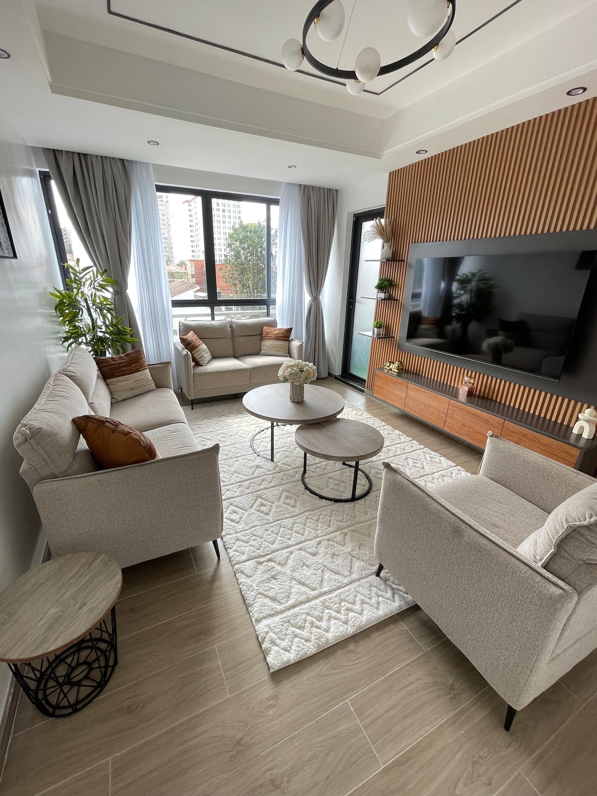 Welcome to your elegant 10th-floor escape in Kilimani, just 5 minutes from Yaya Center and close to Artcaffé, Mama Rocks, CJ's restaurant , Cedars, and Java. This bright, modern apartment features wall-to-wall windows, panoramic city views, and all the comforts you need for a relaxed or productive stay. • Heated indoor pool, gym & kids’ play area • On-site restaurant in the building • Fast Wi-Fi, smart TVs & inverter backup • Free parking, lift access & 24/7 security