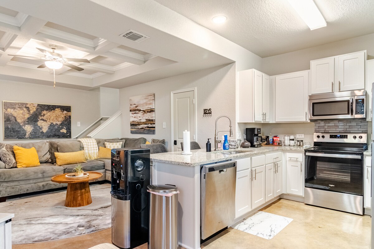 建於2021年的美麗房源! 由當地室內設計師以我們稱之為「中世紀節日」的風格裝潢。 此房源提供3間臥室、2.5間浴室、2間客廳和美麗的三樓露臺。 Mahncke公園坐落在Alamo Heights旁邊,就在DT和許多景點等著您。 這裡有珍珠區( The Pearl District )、阿拉莫( The Alamo )、著名的河濱步道( Riverwalk )、植物園( Botanical Gardens )和許多博 設備齊全的廚房、兩臺智慧電視、WiFi、無鑰匙入口和停車位。