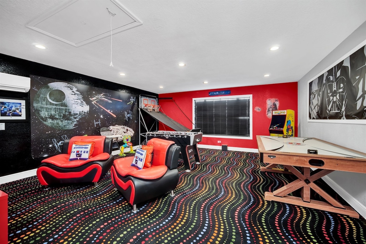 時尚設計、奢華舒適和無盡娛樂的完美平衡,坐落在3.5平方英里的 Reunion 度假村,景色迷人。您將擁有自己的私人泳池、溢出式水療中心、星球大戰電影遊戲室,配有彈球、經典街機遊戲和卡拉OK、漫威兒童房,配有管狀滑梯和雙層床、最新的Xbox Series S、2000平方英尺的泳池甲板、火坑,甚至還有隱藏在樓梯下的哈利波特櫥櫃,距離迪士尼幾分鐘路程。