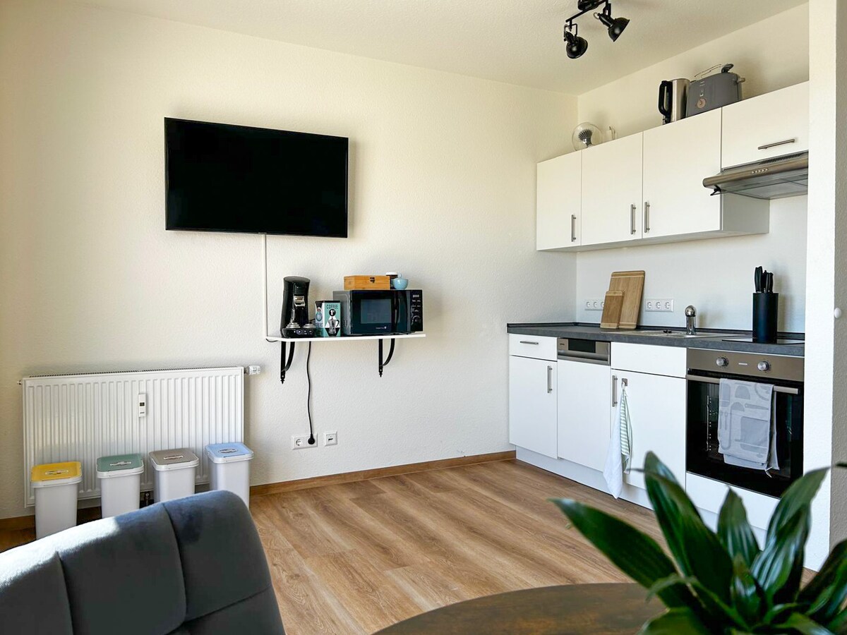 新翻修的公寓,靠近市中心,位於一樓。帶陽台。非常適合4人入住,有2間臥室和1間客廳。如有必要,還有 2 人可以睡在沙發床上。配有淋浴間和浴缸的浴室以及設備齊全的廚房,包括 咖啡機是公寓的一部分。在配有智慧電視(Amazon Prime、Paramont 等)和 PlayStation 4 的舒適客廳中放鬆身心。完美的住宿,讓您放鬆身心!