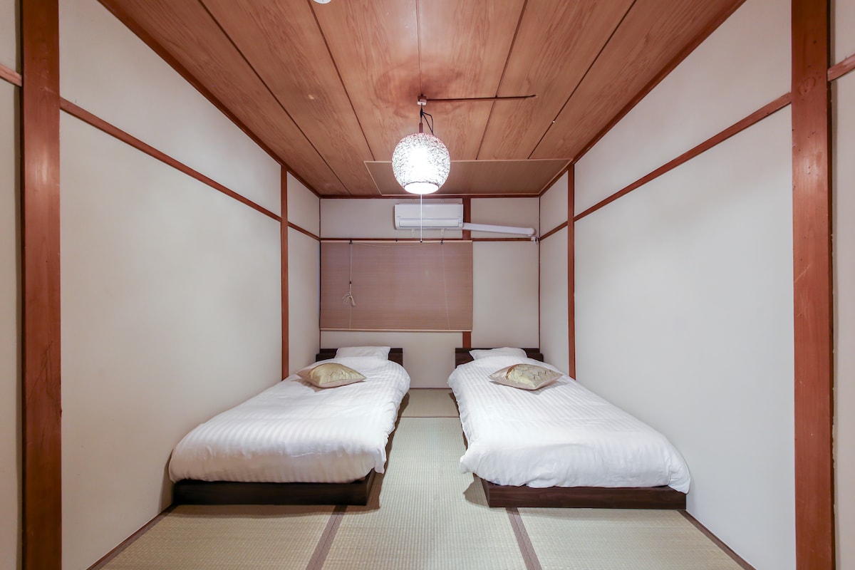 紧邻阪堺电车的帝塚山四丁目站,天王寺只需15分钟的电车车程. 前往难波则需20分钟,交通便利。 步行5分钟即可到达南海电车的帝塚山站,前往机场也很方便。 -最大入住人数:4人 -提供2张单人床和2套榻榻米 -传统日本美学与现代风格和谐结合的舒适空间 -房间内配备了女性喜爱的护肤用品。 -1楼的入口区配有带洗衣粉的洗衣机,2楼的客人可以共享使用,适合长期入住。 *不能做饭, *提供了迷你厨房,您可以享用自带食物或外卖。 周边景点: 周边有丰富的日本文化和历史,像住吉大社和以刃物闻名的堺,交通便利。 提前入住: 请提前咨询 入住时长: 可接受短期和长期住宿 特别体验: 在邻近建筑的酒吧里,与当地人互动。