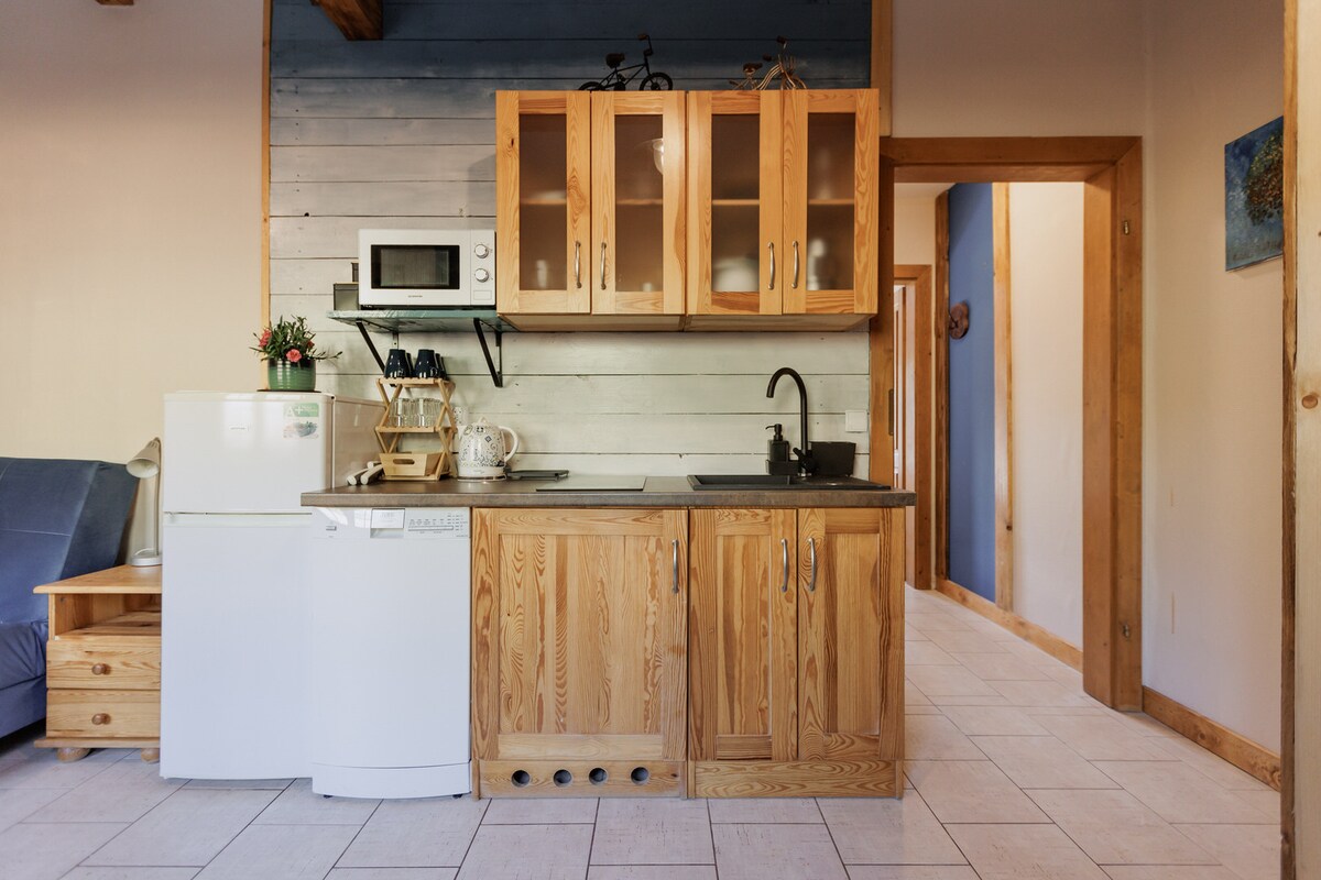 在山上,在1850年的一棟房子裡的森林下,我們為您重建了一間40平方公尺的公寓:) 獨立入口、配備雙人舒適牀的臥室、兩張沙發牀、配備小廚房的房間、配備加熱地板的浴室,確保住宿期間的高度舒適感。 房子位於擁有100多年歷史的果園中,可俯瞰山脈、周圍3小時的草地、攀巖小徑、森林。 在美麗未受污染的大自然中,遠離城市的喧囂,在田園詩般的鄉村氛圍中休閒。