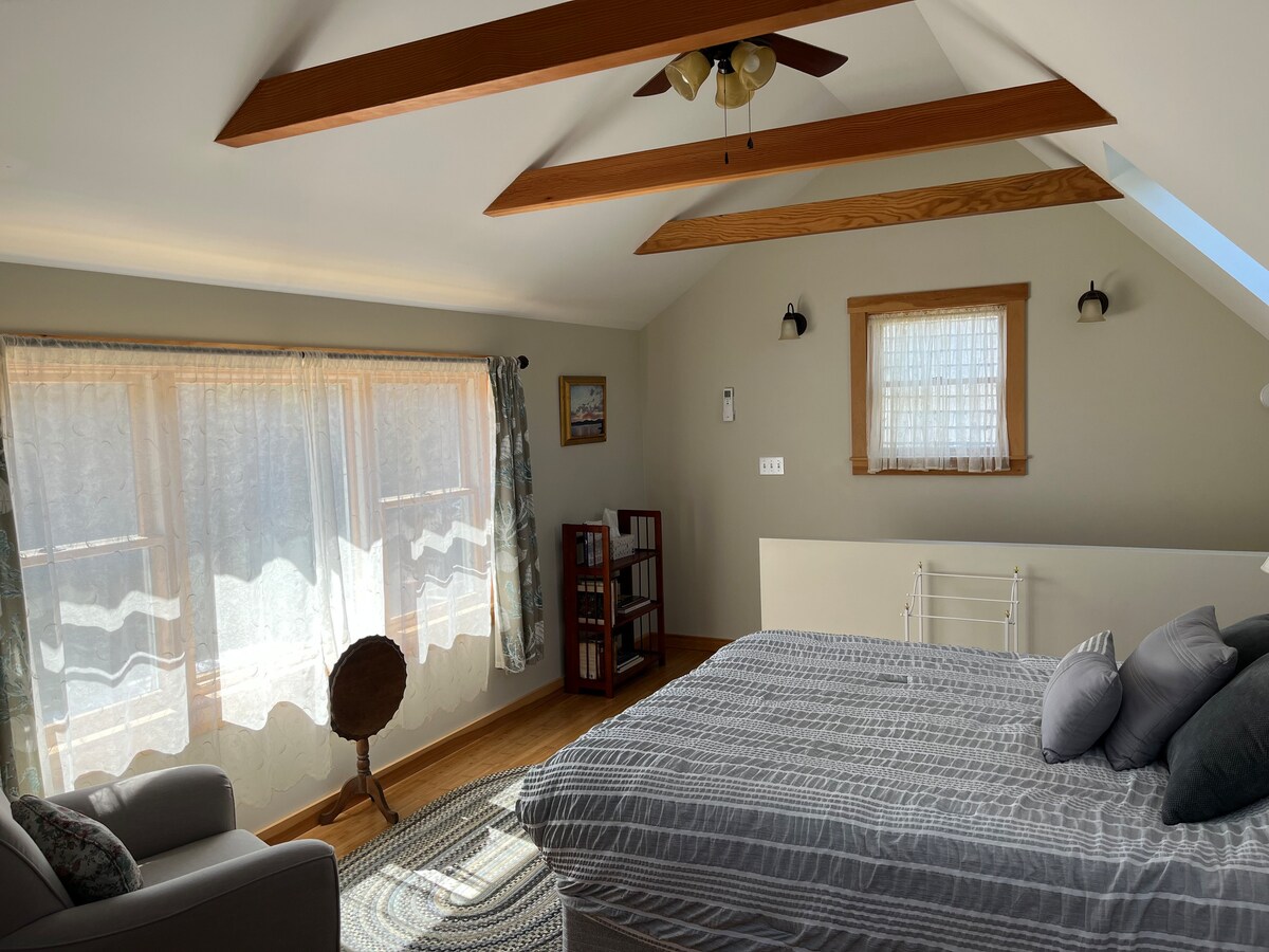美麗的樓上套房,有獨立入口。標準雙人床可欣賞巴蒂山景。配有電視(DVD和CD播放器)的客廳。小廚房配有水槽、微波爐、小冰箱和咖啡壺。 提供咖啡和輕食。 配有淋浴間的獨立浴室。安靜方便的位置,靠近城鎮。步行即可抵達商店、餐廳、公園和港口。 開車不遠即可抵達卡姆登山州立公園(Camden Hills State Park),可徒步旅行和觀光。