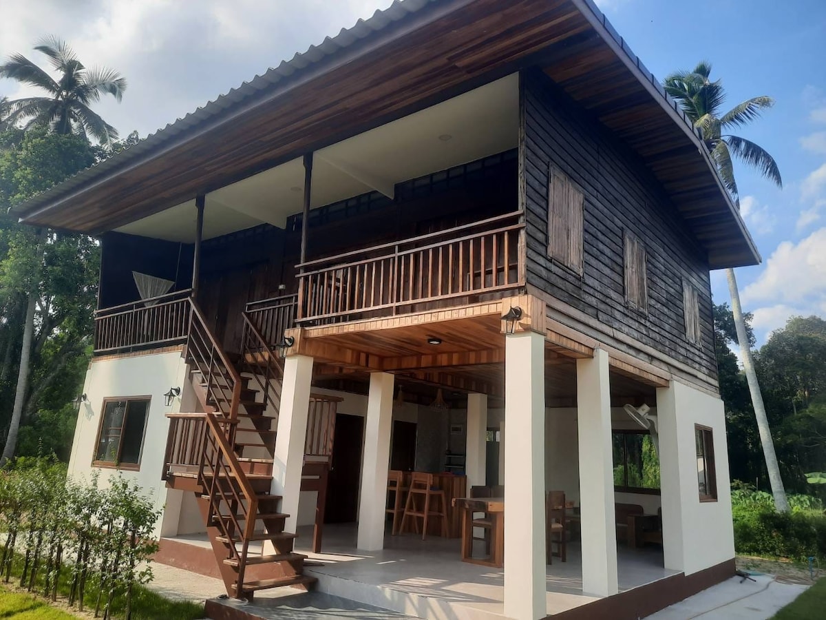 A unique modern Thai style house. This special place is the center island. Private, quiet, atmospheric. This house combines the possibility of accommodating lovers of comfort with air conditioning, as well as for lovers of sleeping outdoors to the sounds of nature. 1 floor [Modern style] Big patio Open kitchen+living room Bedroom [aircon] Bathroom with hot water 2 floor [Classic Thai Style] Living room [fan] Gardrobe room [fan] Bedroom [fan] Balcony [garden view]