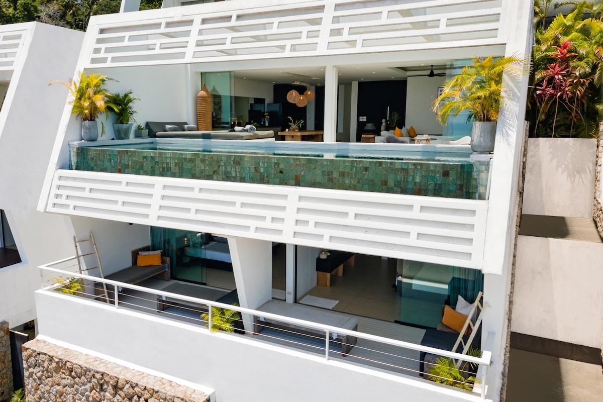 這棟令人驚豔的三層豪華別墅於 2026 年 1 月經過全面翻新,設有私人海水無邊際泳池,提供兩間 40 平方米的大套房和一間雙人睡房(共三間睡房),最多可容納 6 人。 180度海景和樹冠全景。 - 1Gb超高速光纖WiFi - 85吋超高清家庭影院 200平方米+私人停車位,包括全方位禮賓服務和24小時健身房使用權,距離蘇梅島最美麗的海灘、餐廳和商店5分鐘。