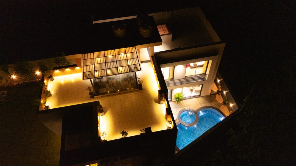 Preeti的Cloud9 Pool Villa,Hugh Pool,地理位置優越,靠近熱門景點,距離著名的美食店僅200米,享受配有水軟化器的巨大私人泳池、充滿活力的Z世代裝飾、主題房間和現代舒適設施,如空調、浴室的軟水、廚房的RO、間歇泉、篝火和燒烤設施,以及所有房間和客廳的音樂系統和智能電視。非常適合朋友和家人入住,配有全套廚房和友好的接待。立即預訂!