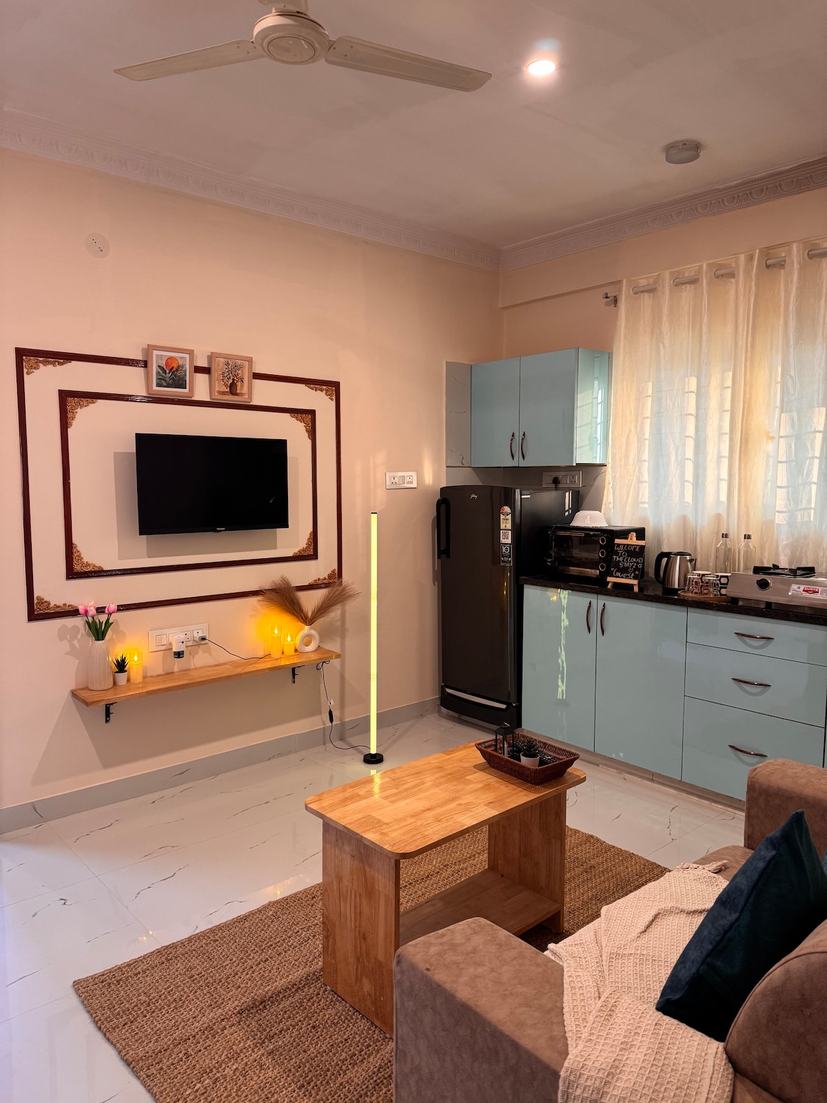 歡迎來到我們全新的高級1-BHK公寓,非常適合尋求舒適和私隱的情侶和旅客,位置極佳。 臥室有一張標準雙人牀,配有柔軟的矯形牀墊,讓您睡個好覺。 在舒適的客廳放鬆身心,配有智能電視、快速WiFi和開放式廚房區域。 配備超級乾淨的浴室,備有浴室必需品。 設備齊全的廚房配有高品質的電器和陶器,為您的烹飪冒險做好準備!
