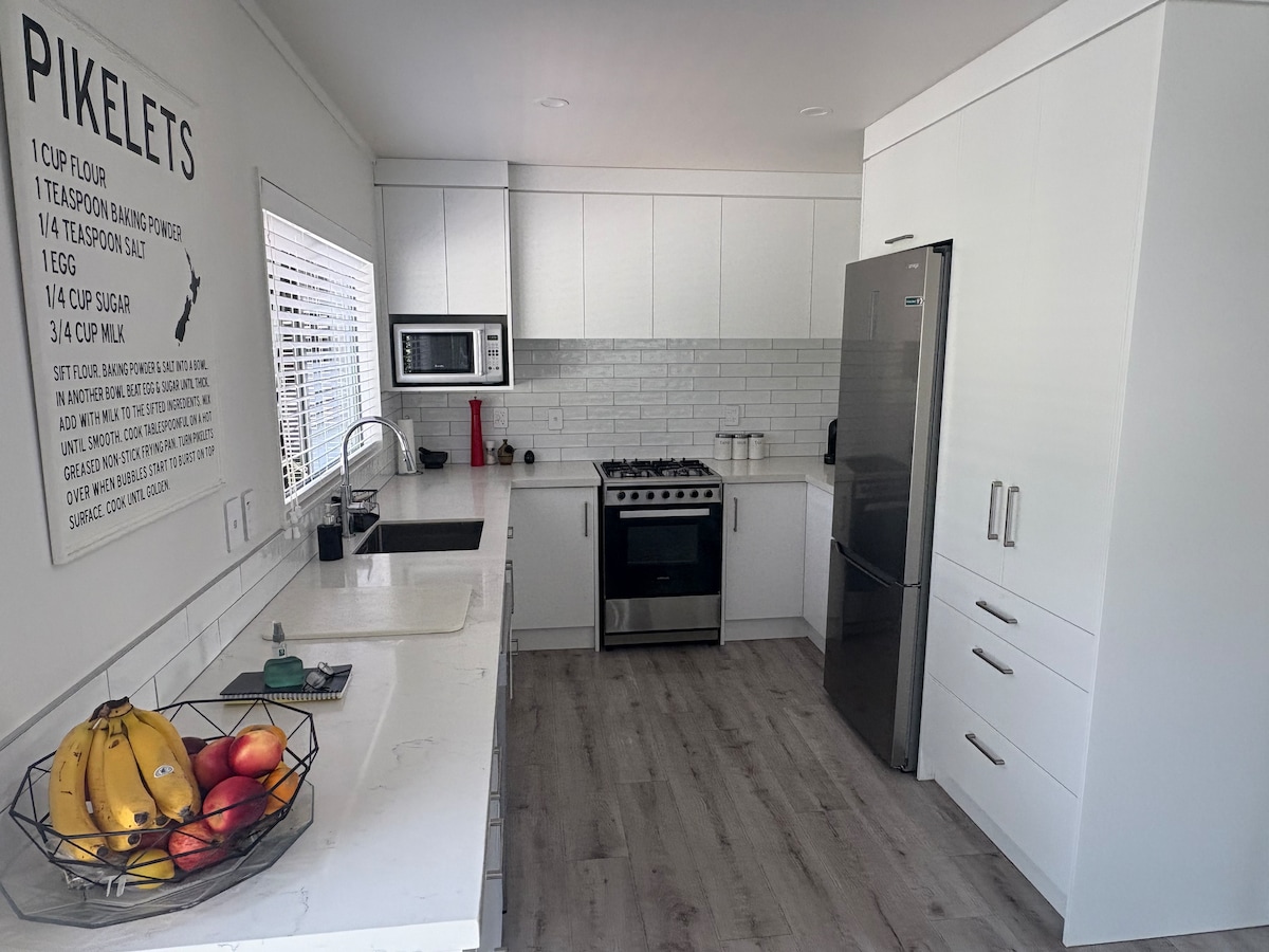 我們房源的一樓公寓,現代風格,包括2間臥室(每間配有標準雙人床)、帶小廚房(無爐具)和電視(Netflix )的客廳。 從我們房子的前門進入,入口大廳有一扇門通往您的住宿。臥室有遮光窗簾。獨立浴室,配備淋浴間和馬桶。提供洗衣機和烘乾機。路邊停車位可停1輛車、WiFi、步行即可抵達Ahuriri的小海灘、餐廳和咖啡廳。
