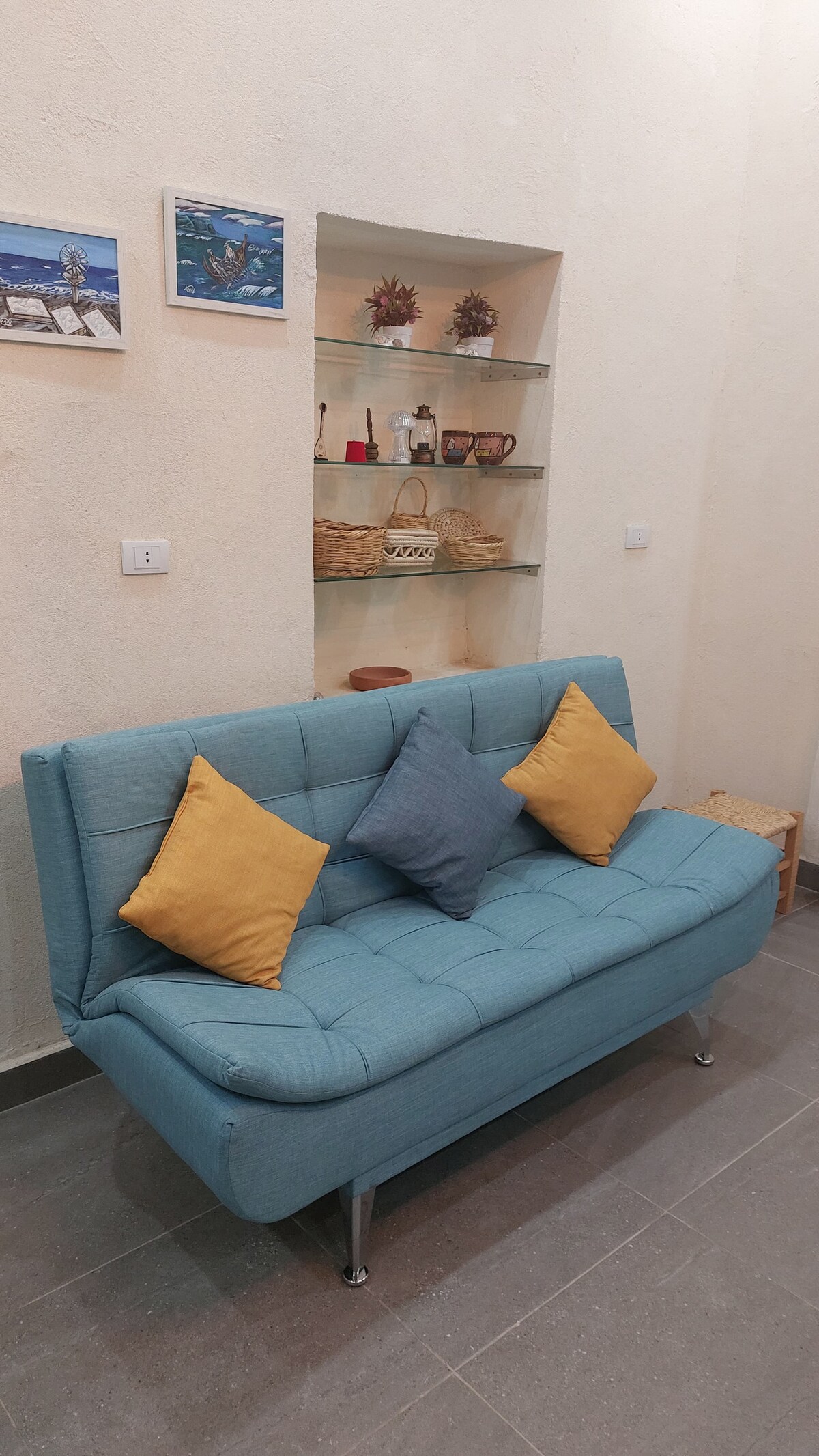 Welcome to your home by the sea of Anfeh! The Happinesst 2 is a peaceful guesthouse with 1 double bedroom, 1 living room with a daybed, a kitchenette (sleeps 2 to 3 people), and a shared balcony with The Happinesst 1. We’re a 1 minute walk from Anfeh’s Taht El Rih and the sea from any side.
