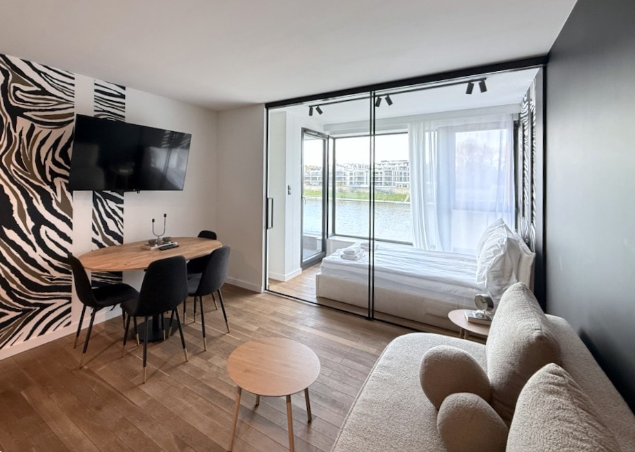 The 46 m² apartment, intended for up to 6 people, combines modern design, functionality, and a unique location with a river view, making it an ideal choice for both city breaks and longer stays.