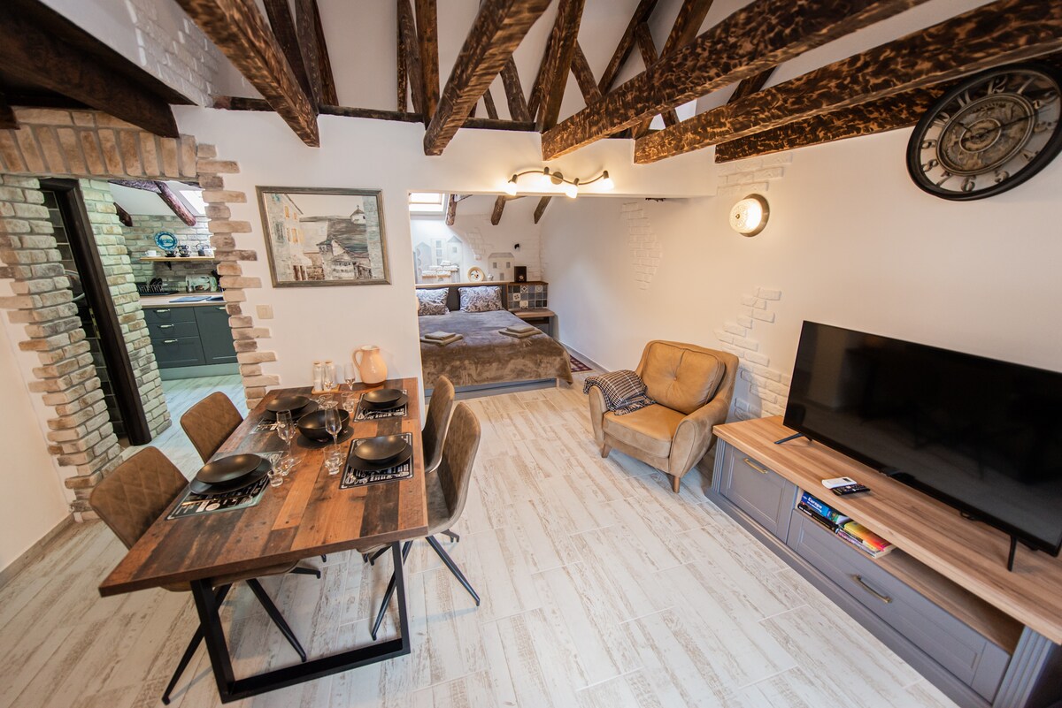 Plunge into medieval charm of our XV-century romantic and stylish Old Town Rooftop Loft with gorgeous views over historical center skyline while being surrounded by modern comfort and serenity. Newly renovated with love, our home has everything one might need for enjoyable stay: king-size bed, strong WiFi, dining area, TV, AC, couch, washing machine, and fully-equipped kitchen. Centrally-located with restaurants, bars, shops, and cafes just over the corner.