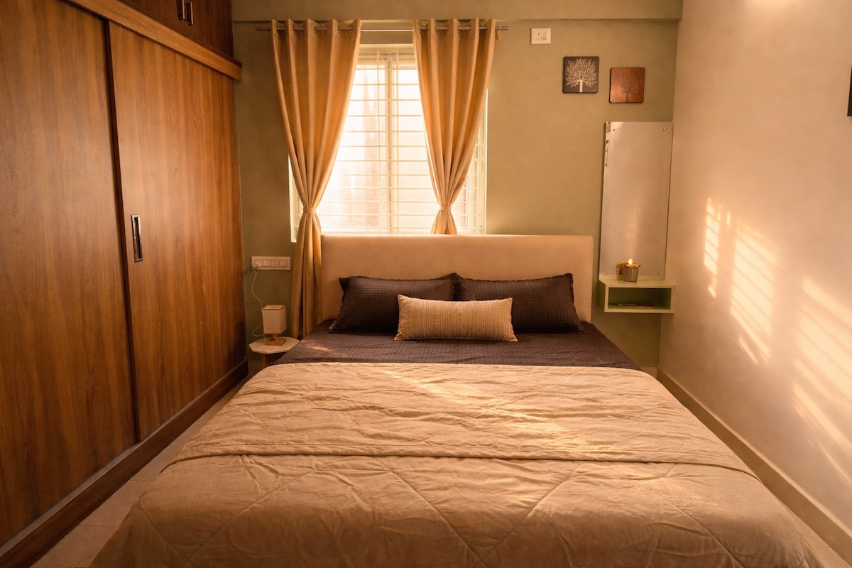 我們的高級1 BHK公寓坐落在懷特菲爾德市中心,四周環繞著鬱鬱蔥蔥的綠色植物,精心設計,提供高品質的住宿體驗和極致舒適。 我們在臥室使用wakefit 10英寸記憶泡沫牀墊,在大廳使用阿米巴沙發和牀,提供極致的睡眠品質和背部支撐。 我們設計了廚房空間,配有現代化的廚房用具,包括迷你吧套裝。 其他設備與服務包括100 Mbps WIFI、靠近地鐵站和IT樞紐。