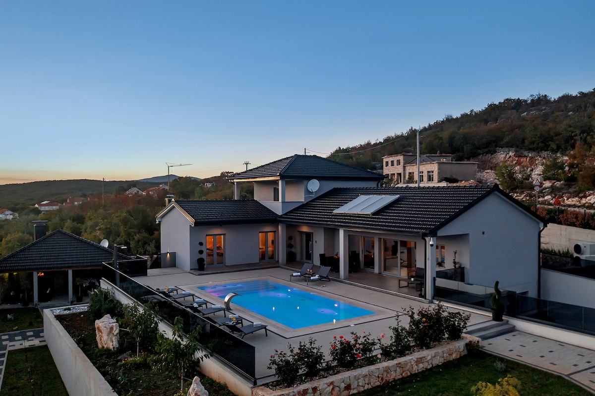 我們全新的豪華別墅Joy位於一個美妙的位置,景觀美麗,私密性最大,但仍然非常靠近所有當地景點。別墅新建,提供最大的舒適和奢華,配有4間套房臥室和您可能需要的所有其他設備。一個大型私人溫水泳池、6人按摩浴缸、紅外線桑拿房、私人電影院和遊戲室、撞球室、一個巨大的圍欄戶外區域,配有足球場、羽毛球場或乒乓球場。