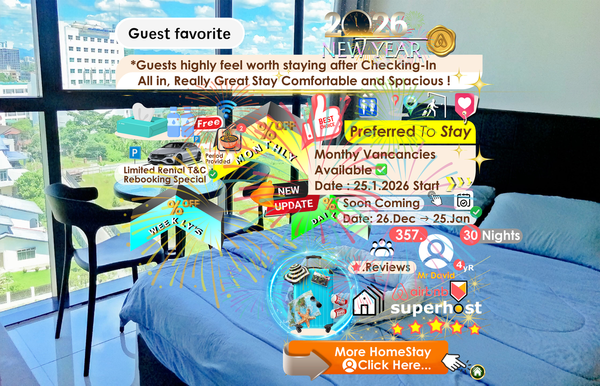 Forget worries in this spacious and serene space of muji style home stay at 12 level. ✅Unique & beautiful high sky, sunset, city view & peacefully quiet place. ✅Handpicked most comfortable bed no other homestay could provide. ✅Relaxation fun stay. ✅10 minutes drive to town. ✅15 minutes drive vivacit ❗Please inquiry for Parking lot if you need one as we have limited quota per month. For security purposes. A photo of your identity card is required.