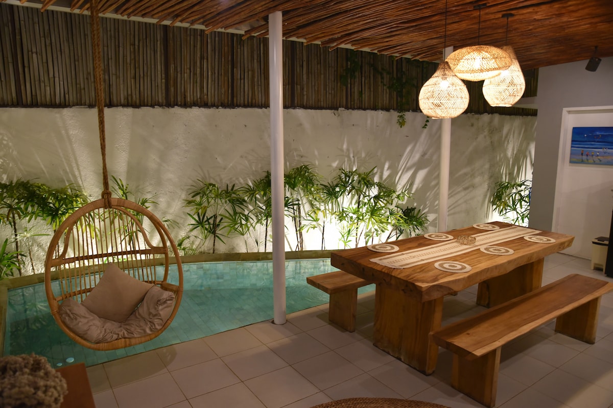 Kammi Villa是一間2房熱帶度假屋,明亮、寬敞、完全私密,設有清涼泳池和開放式客廳。 非常適合尋找舒適和寧靜的情侶、朋友或小家庭。 兩間睡房均設有電視、書桌和套房浴室,讓你享受酒店式的住宿體驗。 坐落在寧靜的烏加桑,靠近海灘、咖啡店和機場。