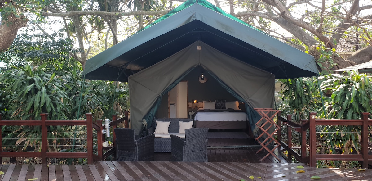 A fantastic glamping experience in Trafalgar, South Coast of Kwazulu Natal. A big property surrounded by lush bush, a small lake and two small dams stocked with fish. The beach is a mere 4 minute walk away and is quiet and unspoilt. Each tent has its own unique feel. Falcon tent is great for quiet and great for bird watching. The rate is charged per person. Children under 12 years old pay half the base price.