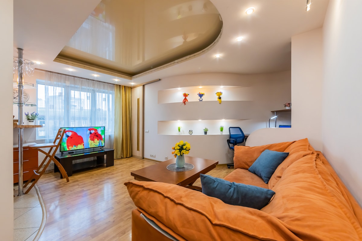 Take in far-reaching 180-degree city vistas from this iconic star building right in the heart of the city. It features a concealed fireplace, along with a wealth of designer ceiling lights. All art and ceramics seen in the apartment are made by local Ukrainian artists. The place has air filters, heated floors, washer and dryer, work desk, an amazing coffee machine, and much more for your most comfortable stay.
