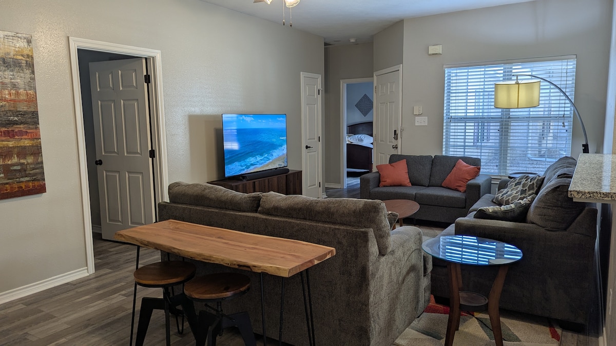 在歷史悠久的布萊恩市中心全新的「中世紀現代」聯排別墅放鬆身心,步行即可抵達Ronin、Black Water Draw、RX Pizza、the Village、Cilantro等多家餐廳。主臥室有一張加大雙人床,每個房間都有58吋以上的智慧電視。登入您的個人串流帳戶,或使用我們的Hulu、迪士尼或ESPN。在私人後院放鬆身心,欣賞美麗景觀,或在美麗的廚房烹飪,包括配有咖啡膠囊和奶油的Keurig咖啡機。