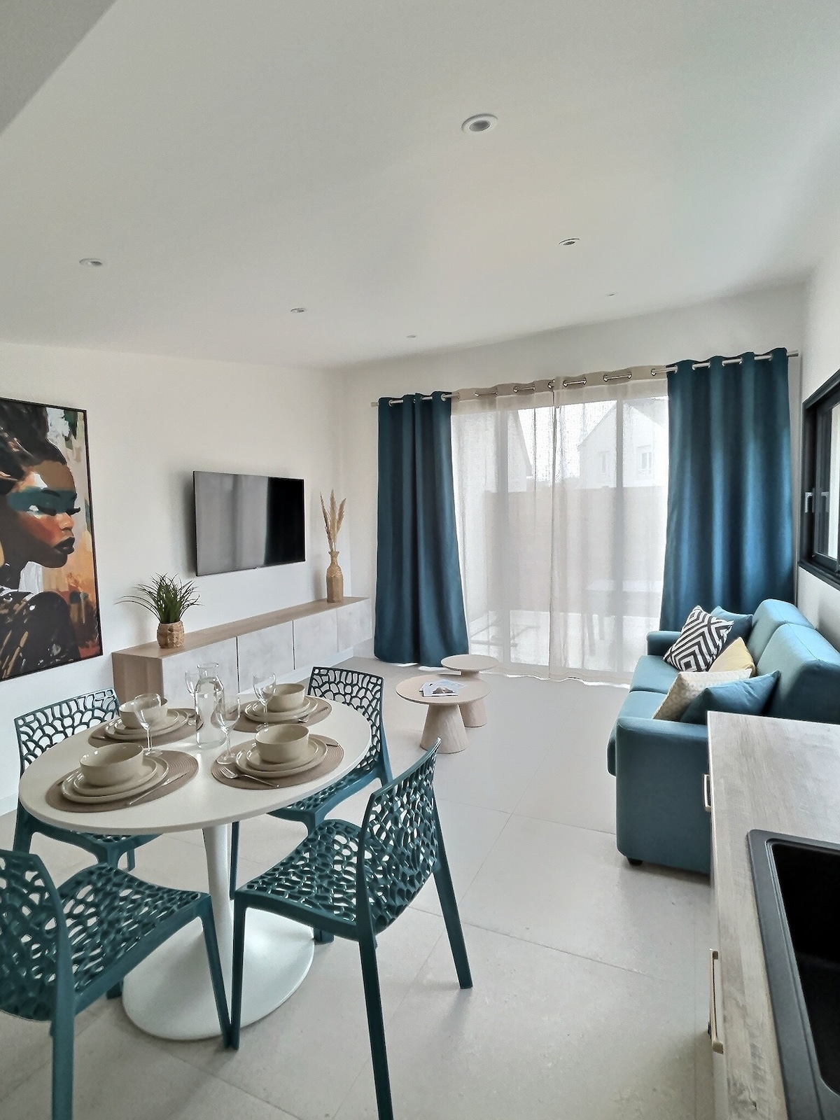 海景單間公寓,景色迷人,二樓。 2分鐘AQUABAULE (海水泳池、土耳其浴室、桑拿房、海洋球場) 由室內設計師翻修的舒適、明亮。 折疊160床、微波爐、冷凍庫、冰箱、咖啡機、水壺、nespresso、吹風機、熨斗、洗碗機、電磁爐、抽油煙機、智能電視、WIFI 社區內有免費停車位 露台椅桌2張躺椅 提供毛巾和牀單