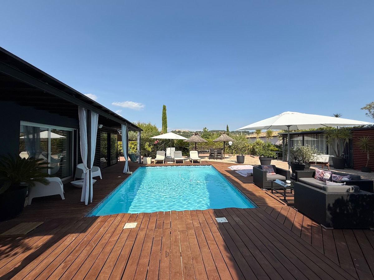 Maison contemporaine au style unique avec de très grandes ouvertures sur l'extérieure, piscine, billard, baby-foot, idéalement placée à 5 minutes à pieds du centre du village de La Cadière d'Azur, 1,2km de l'autoroute vers Toulon, Aix en Provence, Marseille, 8 à 15 minutes des plages de Saint-Cyr sur Mer, Bandol, Sanary, 5 minutes du village Médiéval du Castelet Au calme et très arborée dans son Architecture style "Bali", avec équipements complets, technologique de dernière génération