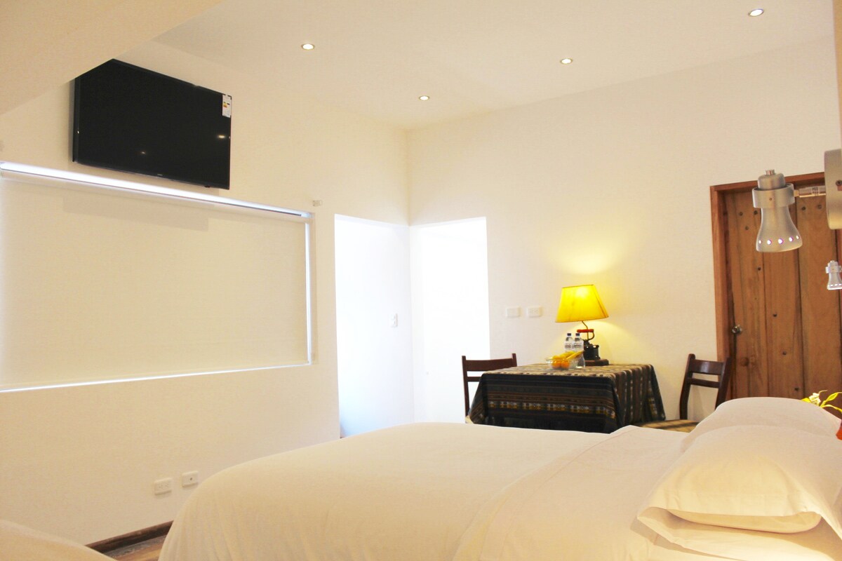 這間安靜舒適的套房位於Baños市中心。WiFi 速度很快。淋浴間很熱。兩者在停電期間都能正常運作。有3扇窗戶,自然光線充足,包括一扇大型辦公桌的海灣窗戶,可俯瞰內院。還有設備齊全的小廚房、桌椅、舒適的雙人床和獨立浴室。這是放鬆身心或完成工作的完美場所。允許攜帶小型寵物。禁止吸煙。