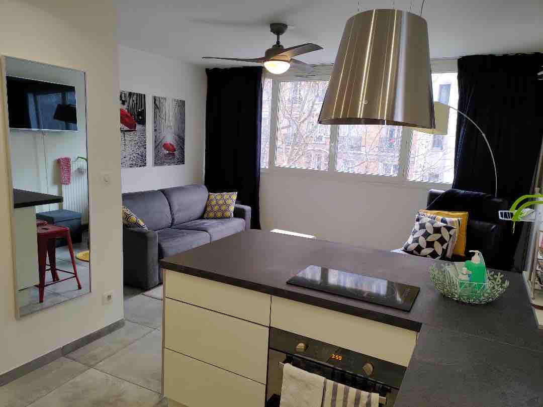美麗的現代公寓,完全翻新,明亮,設備精良,配備大客廳、開放式廚房、單臥室、衛生中心和獨立浴室。 公寓在一條安靜的街道上,位於地鐵附近( Place des Fêtes - 11號線) ,不遠離Jourdain商店、rue de la Villette的酒吧/餐廳和Buttes Chaumont公園。 公寓禁止吸煙,禁止舉行派對。
