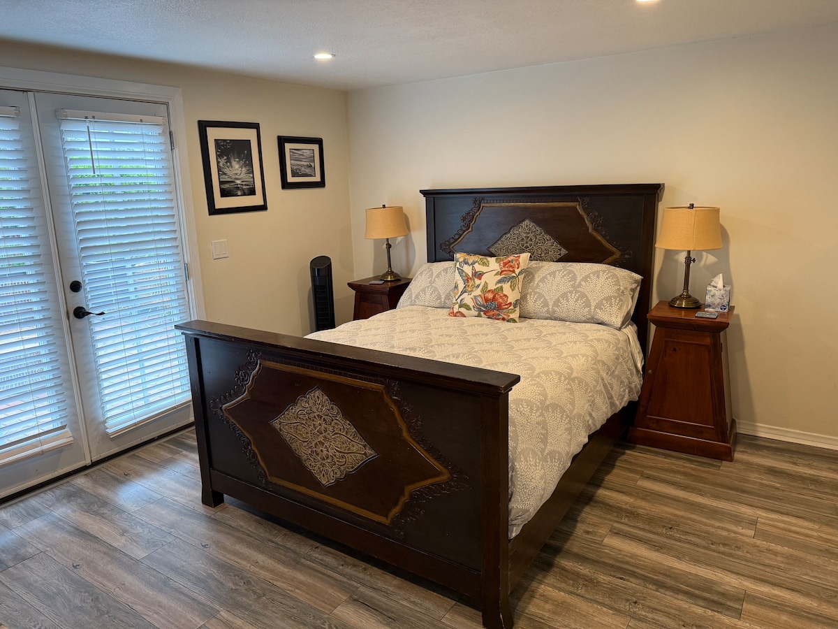 我們的私人單間公寓非常適合需要安靜工作場所的情侶或單身專業人士。 單間公寓配有一張大牀和一張雙人牀(腳輪牀來自圖片中的雙人牀下方。 獨立浴室和後院的通道,有些房客用它來做瑜伽、冥想和孩子們四處奔跑 開車前往市中心和/或主要海灘需10分鐘。 包括一輛車的私人停車位。 距離徒步道、UCSB、海灘等地僅幾分鐘路程。