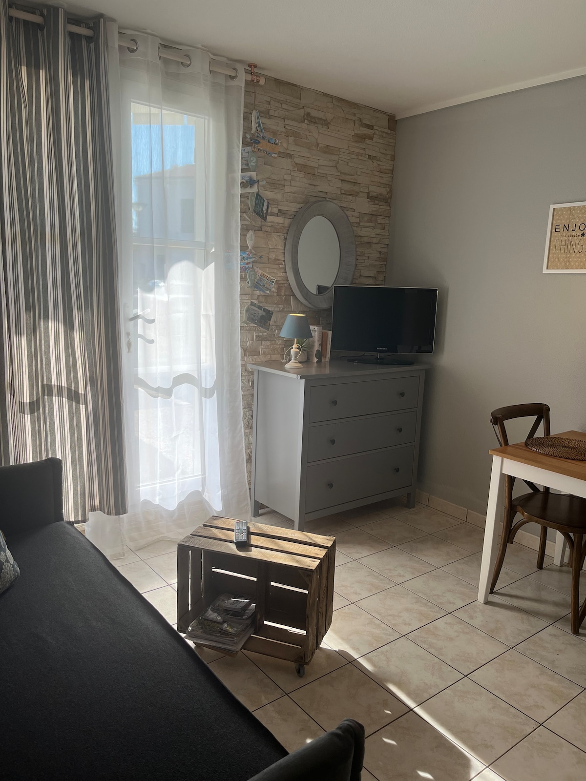 A 100m du marché,150m du port ,12 mn à pieds de la gare ,dans une rue emblématique du CV, cet appt au 1er étage sans ascenseur pouvant accueillir 4 pers comprend: entrée/ séjour/ cuisine US/SDE+WC /1chambre.Le mariage du bois et de la pierre dans un esprit épuré vous séduirons. A votre disposition; linge de maison/WIFI/micro onde/TV/enceinte/sèche cheveux/fer/grille pain/lave linge/four/HIFI..CARPE DIEM c'est aussi une philosophie laissez vous porter nous nous ferons un plaisir de vous guider!
