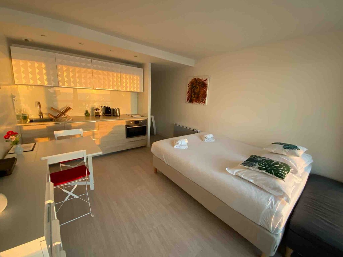 真正的放鬆時刻……坐落在小小的死胡同下,坐落在世紀初美麗住宅的一樓,坐落在市中心23平方米的溫暖工作室。 完全翻修,面向南方,有3扇大窗戶,起居室有一個開放式廚房和酒吧,更不用說電視和WIFI了。 淋浴間配有馬桶和梳妝臺,完善了這間優質的公寓。 所有商店和生活場所, Les Halles ,就在附近。.et.. LA MER A 2 MN A英尺。