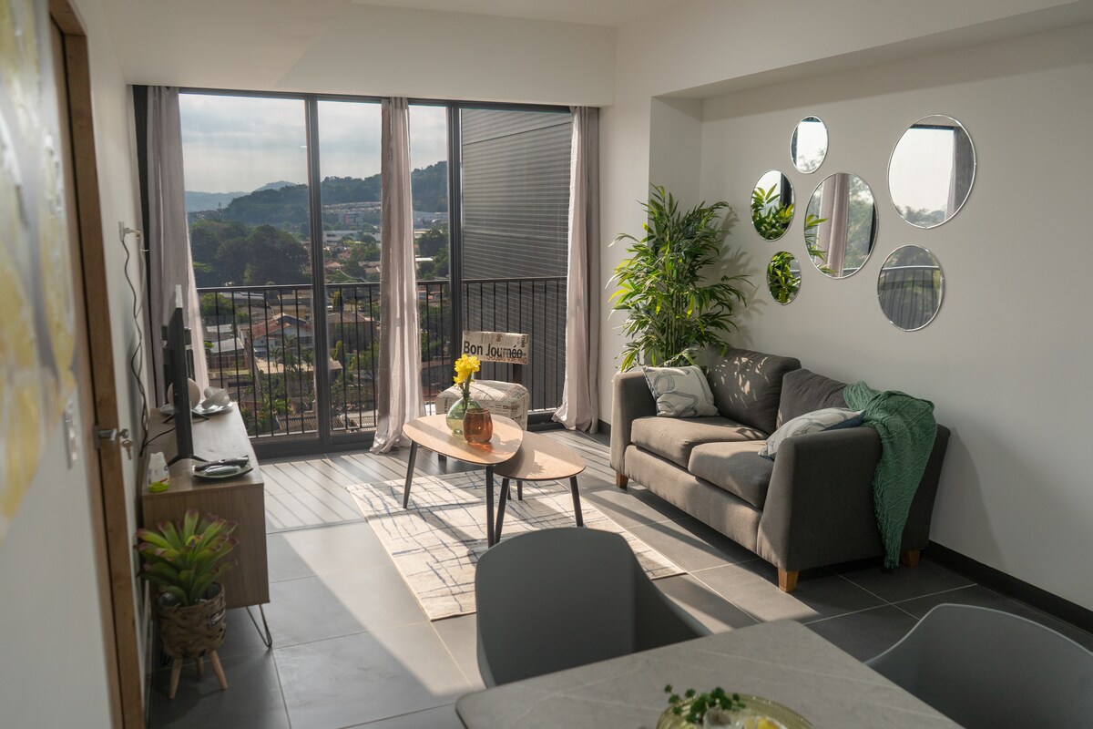 享受這間現代裝飾公寓的優雅;其明亮的木質環境非常適合逃離日常生活和放鬆身心。每天醒來,欣賞山景和城市的壯麗景色,在露臺上喝杯咖啡,在建築群的私人戶外步道上散步,或在附近的「El Boqueron」或「La Libertad」海灘發現薩爾瓦多的美麗。