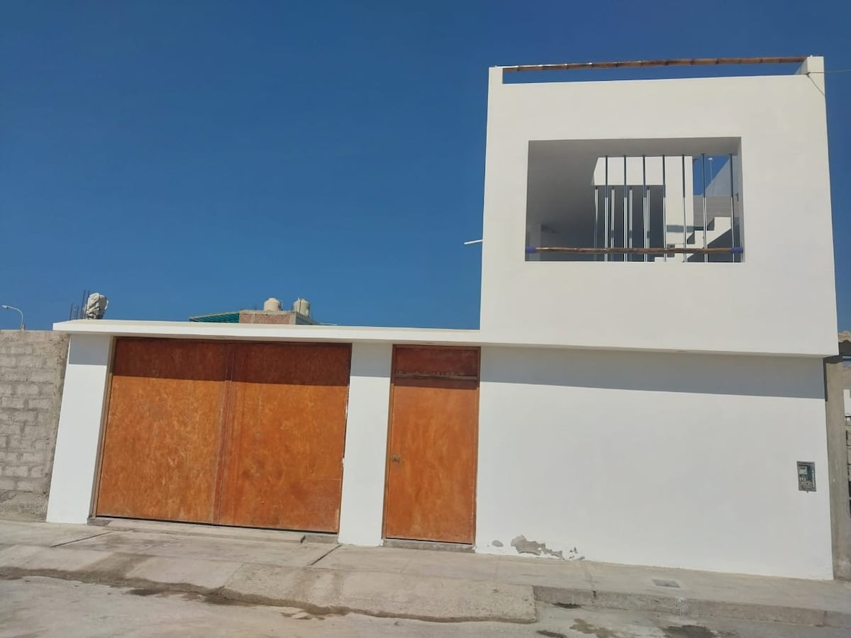 Casa familiar con todos los servicios básicos y tanque de agua de 600 litros. Muy cerca de la playa y cuenta con espacio en la cochera hasta para dos vehículos, con camas hasta para 8 personas.