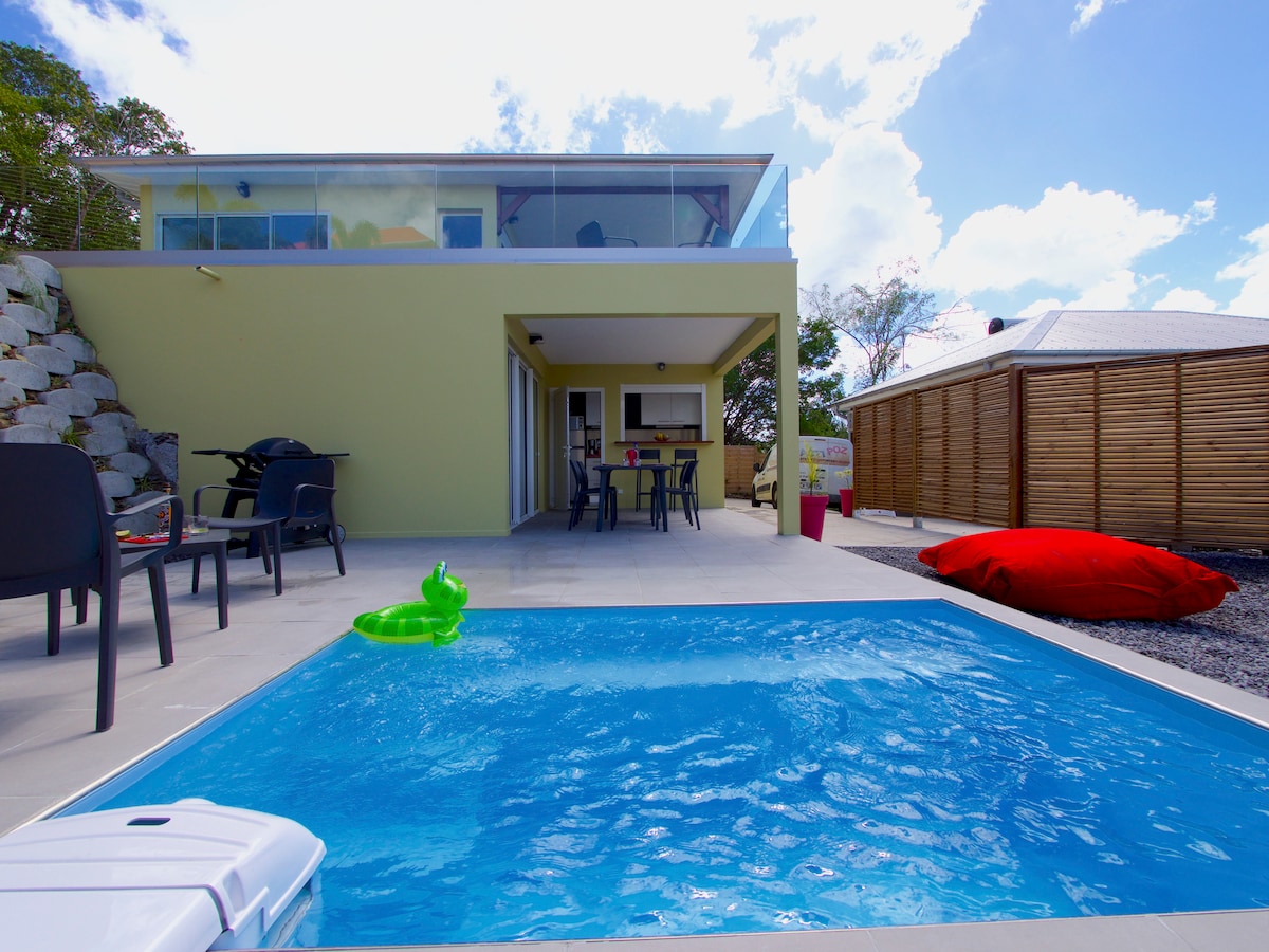 安靜、浪漫的2房公寓105平方公尺,私人「泳池屋」空間,專屬於您:水療、泳池、烤肉、平板、乒乓球和休閒區。所有這些都在綠色環境中,可俯瞰加勒比海、佩萊山和法蘭西堡灣的全景。從Bourg des Trois-Ilets開車2分鐘即可抵達餐廳和商店,距離最美麗的海灘10分鐘。:參觀島嶼的最佳地理位置。封閉式停車位。光纖網路