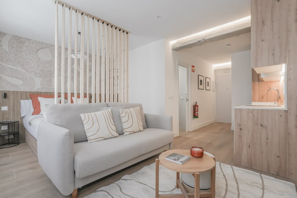 “Vine” apartment is located in Madrid center, off Gran Via, on a quiet street in a new building with elevator. It is nature-inspired, bright & modern, has WiFi, is fully equipped and is very close to restaurants, tapas, the Metro, shops & galleries. Best for a single, couples or couples with a kid! Pets are invited happily!!! The apartment is located in a new buliding, with an elevator! It is modern designed, with lots of greenery, themed to its name, Vine. A huge window along the length of the whole apartment overlooks a beautiful private garden. The apartment consists of a bedroom with a double bed, a living area with a single pull-out sofa, kitchen and bathroom. It has WiFi and is fully equipped, including a washing machine, TV, air conditioning, and Nespresso coffee maker - all just ready for your comfort and enjoyment! The apartment is a studio open space apartment - and it's all yours to enjoy! There are no areas in the apartment that you cannot use or access! We love hosting, but also respect our guests' privacy! We are here for you as much as you would like! Located just off Gran Via in lively buzzing Malasana neighborhood with its great range of authentic cafes, tapas & bars. Huge Zara Primark & Mango are minutes away. Best Madrid sites like Royal Palace, Puerta del Sol & Museums are in walking distance The Central Metro Station Gran Via is a 2 minute walk from the apartment. From there you can take the metro to anywhere you want in Madrid and also to all the train stations that will take you out of Madrid to the rest of Spain. If you come by car, a big parking lot is located at Barco 1, Madrid, just a minute from the apartment. There is also a bicycle-rental station close by. A hosting kit of water, soda, milk, coffee, tea and sweetners will be waiting to welcome you :-)