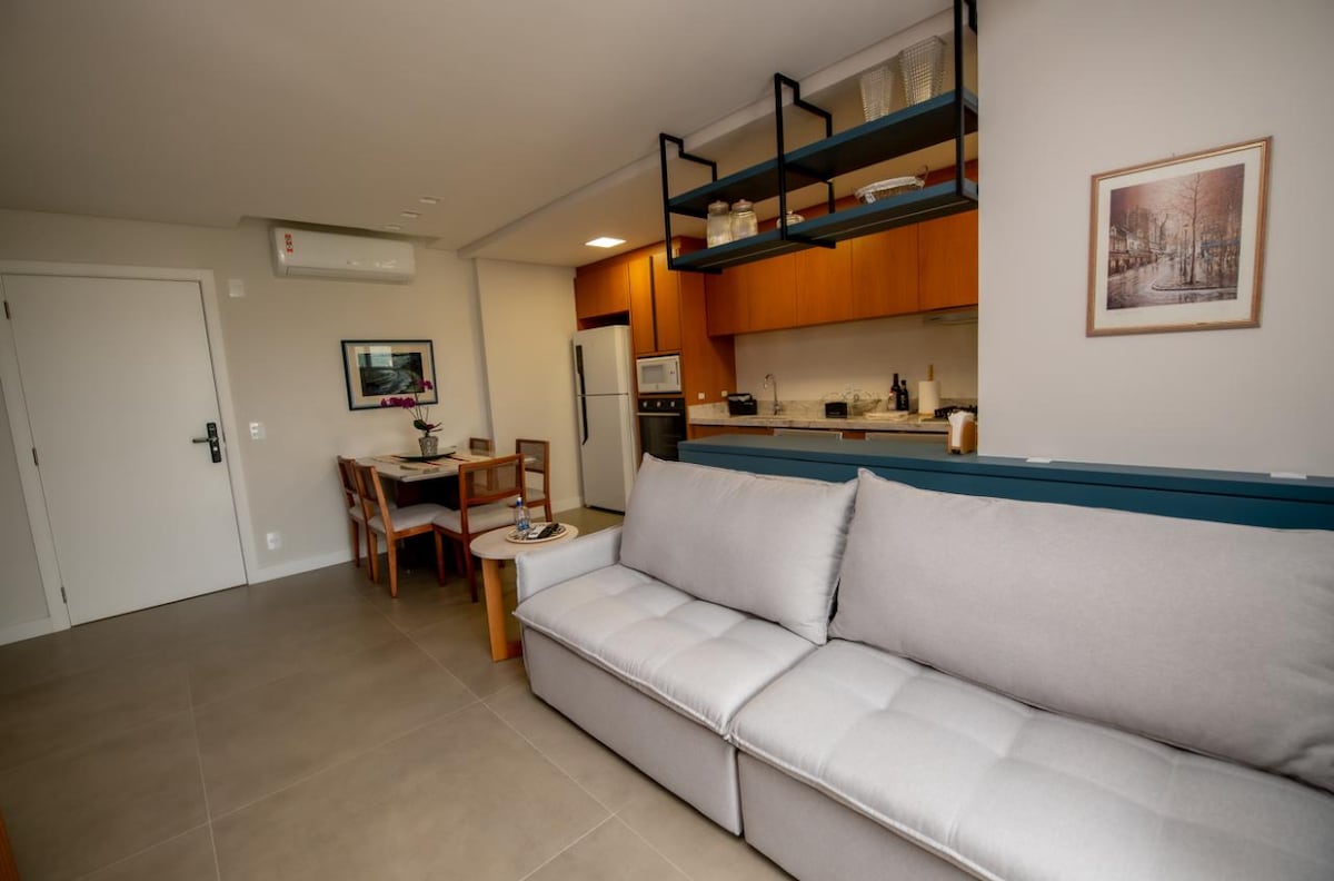 Estúdio super completo, conforto e luxo. Possui uma cama de casal e um sofá-cama para duas pessoas. Totalmente mobiliado e equipado com TUDO que uma casa precisa ter. Roupa de cama de algodão egípcio 700 fios. Televisão 70 polegadas com internet e Netflix disponíveis. Toalhas super confortáveis e esterilizadas com produtos especiais! Cafeteira com cafés gourmet disponíveis. Ar condicionado quente e frio. Uma vaga de garagem