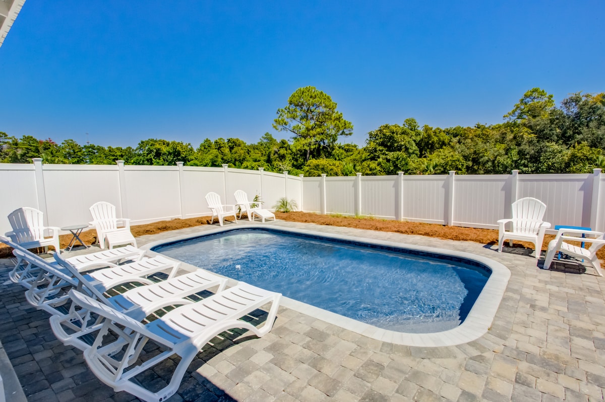 Palms by the Beach has a luxurious homey feel with pool, outdoor shower, private yard, 7 mins walk/3 mins drive to the beach. Great for a family or friends getaway! Perfect location! Less than 10 mins drive to Pier park, 8 minutes to Rosemary Beach & 30A. Destin is a short drive too! Feel at home with a fully stocked kitchen. Comfortable bedrooms and outdoor space with dining and grill area. 2 Adult Tricycles and 3 Kid scooters included! 4-seater Golf Cart available for rent $85 a day!