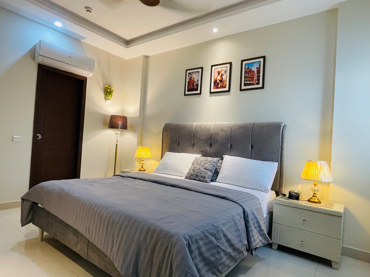 ★ 位於PENTASQUARE DHA FASE 5 ★ 1臥室豪華公寓 配備沙發牀的★豪華客廳 ★ 三星QLED電視 ★ 1間配備特大牀的臥室 ★ 1.5間配備現代配件的浴室 距離Dolmen Mall需★5分鐘車程 面向★花園的公寓 使用智慧鎖★入住 大樓內有★雜貨店和咖啡館 ★ 24x7暖氣和冷氣(中環) ★ 設備齊全的廚房。 ★ 免費牀墊 ★ 免費停車 ★ 5G網絡 ★ 全天候備用電源 ★ 乾淨的牀單-免費洗漱用品 ★ 全天候保安和接待