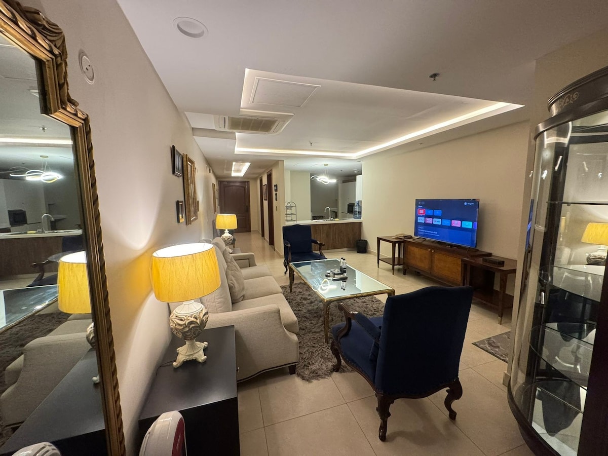DHA第4期金飾商場2居室公寓。 現代生活空間公寓的設計以舒適為念,主套房有兩間舒適的臥室,配有加大雙人床,非常適合5位客人入住。 明亮而溫馨的客廳,舒適的座位、智能電視和高速Wi-Fi ,適合工作或娛樂。 設備齊全的廚房,可享用商場許多餐廳的外賣。 三間現代化的浴室乾淨、維護良好,並備有新毛巾和基本洗漱用品。