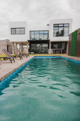 Moderna y cómoda casa nueva ☆ Cocina integral Refrigerador Microondas Freidora de aire Cafetera Amplia isla con 14 bancos 4 habitaciones con Mini-split y TV Aire lavado en sala 4 con camas King con memory foam La estancia es para ocho huéspedes; se cobrará una tarifa adicional de $200 por noche por cada uno; en esta caso llevar colchones inflables y ropa de cama extra. Por las sugerencias que recibimos, hemos construido una alberca; baños exteriores y una cómoda terraza frente al lago.