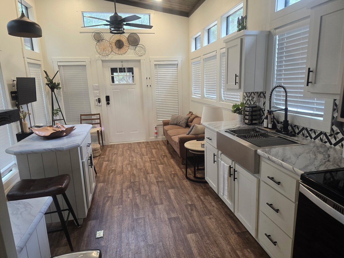 We LOVE helping our guests enjoy quiet and comfortable vacations and invite you to indulge in the epitome of modern rustic elegance amidst the picturesque piney woods of East Texas. This striking tiny home boasts a sleek all-black exterior that exudes contemporary sophistication and blends harmoniously with its natural surroundings. The location provides for quick and easy access to nearby lakes, state parks, marinas, casual and friendly fooderies, event venues, breweries, and wineries.