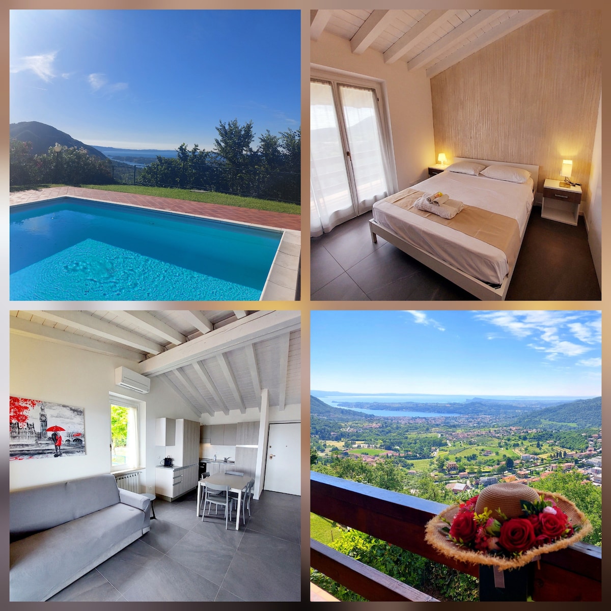 Blu Chalet坐落在獨特的全景位置,從起居區和睡眠區可欣賞到湖景,光線充足,陽光充足。這是一套擁有獨立入口和私人花園的公寓。它有外露的橫樑天花板、拼花地板、一個大陽台,可以在那裡曬或與朋友相聚。 其大小適合情侶和有孩子的家庭。 我們相信您一定會對此感到驚訝。