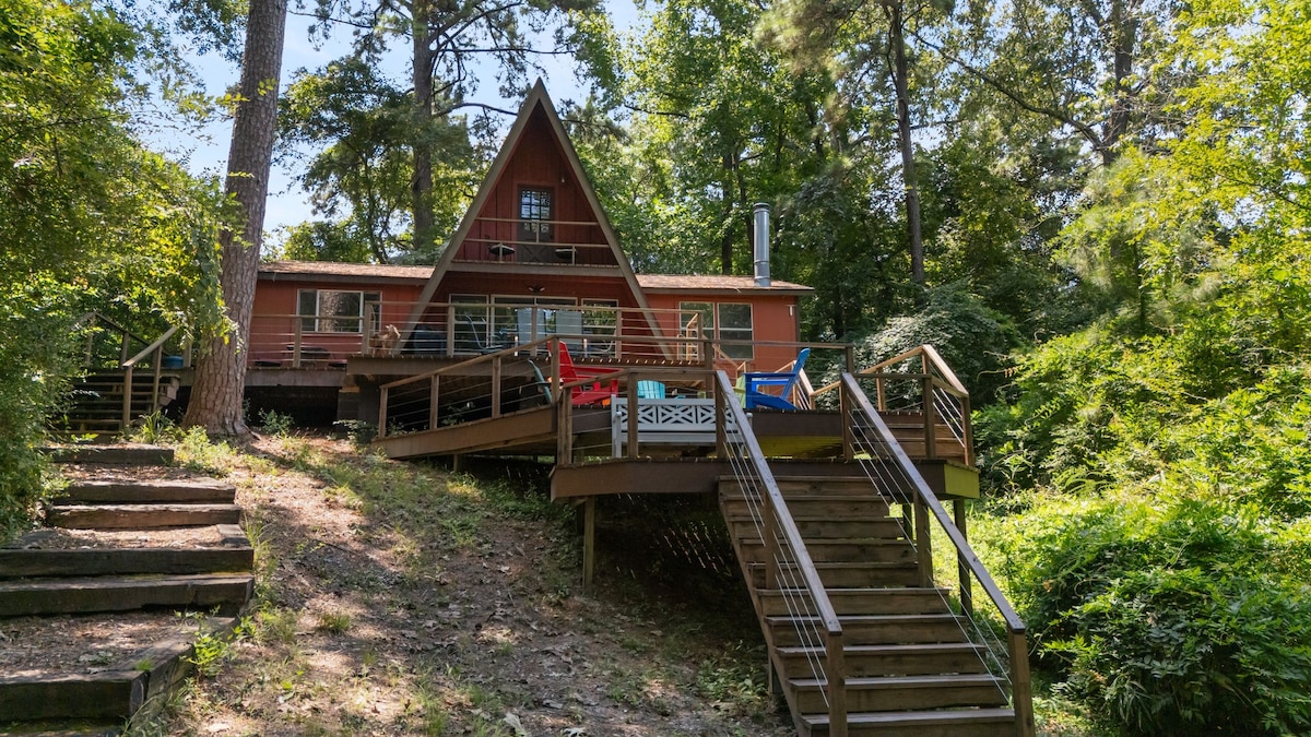 迷人的湖景「A」型木屋,坐落在樹林之間。 可通往湖泊。在泥土路的盡頭,私密又安靜。 3張床和2間浴室,樓上有閣樓。 設備齊全的廚房。非常好的露台。 中央空調和暖氣。小型壁爐,全年享用。 甲板上的丙烷燒烤爐。 利文斯頓湖是一個93,000英畝的湖泊,靠近山姆休斯頓國家森林。 Coldspring鎮距離購物和餐飲地點4英里。 旅居位於休斯敦以北約1.25小時。
