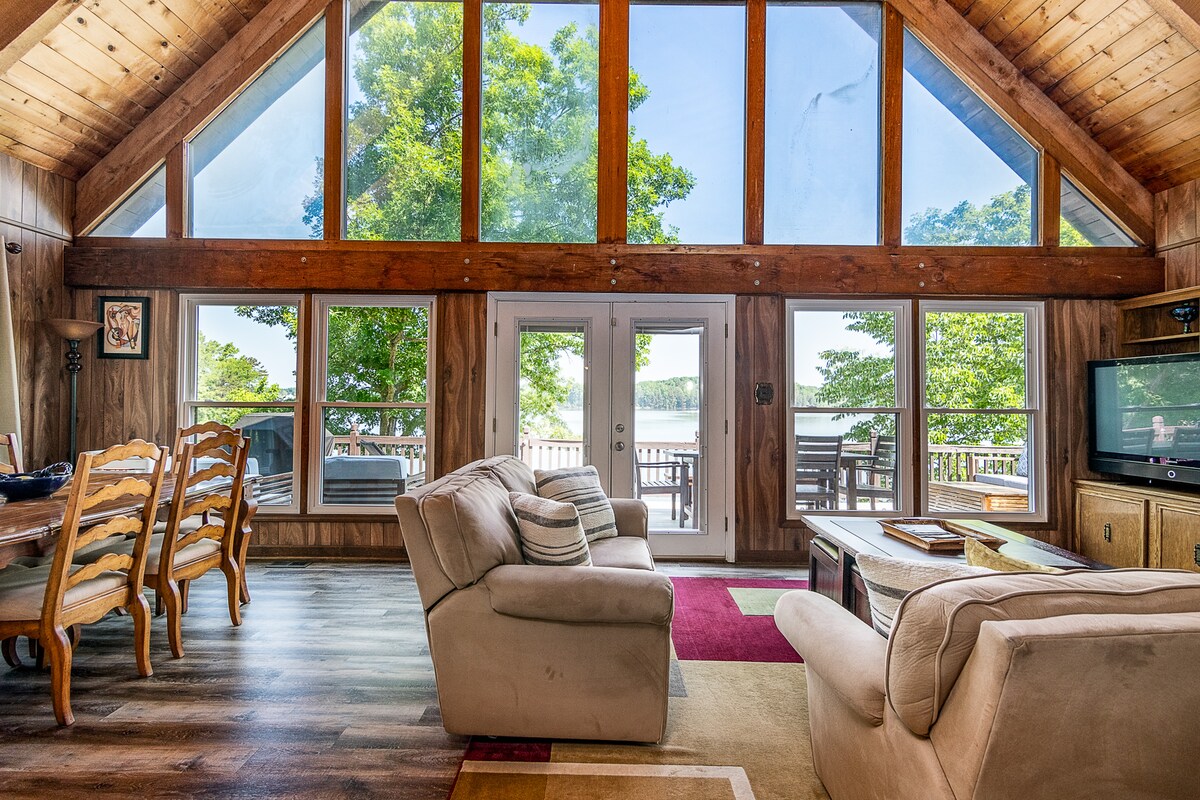 Lakefront Getaway – Relax & Make Memories! A great retreat for relaxation & adventure! Kayak from the private dock, grill on the deck, or go to shops or restaurants. Please note: A home is being built next door, so there will be A LOT of weekday daytime construction noise in April & May. ✔ Sleeps 8 – King, Queen, Full, Twin + 2 Queen futons ✔ Fully Equipped Kitchen ✔ Smart TVs & High-Speed Wi-Fi ✔ Huge Deck + Gas Grill – Dine outdoors with a view ✔ Private Dock & 9 Kayaks ✔ Horseshoe pit