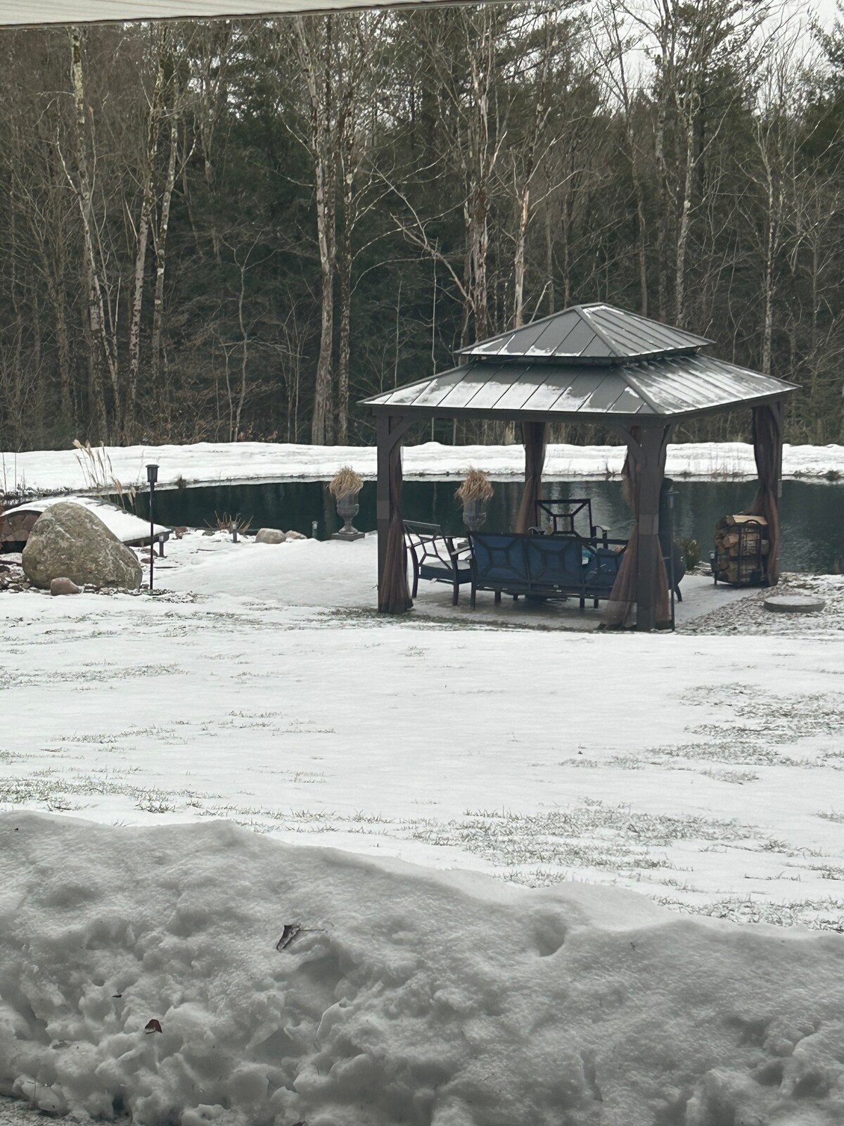Private pond retreat with dock, hot tub, and gazebo—perfect for a peaceful, secluded escape. Enjoy a seamless outdoor layout connecting the pond, seating areas, hot tub, and gazebo with a fire chiminea. Relax by the water, enjoy quiet mornings with coffee, fish from the dock, or unwind in the hot tub under the open sky. Inside offers a clean, comfortable space to relax year-round. Ideal for guests looking to disconnect, recharge, and enjoy a private, nature-filled stay.