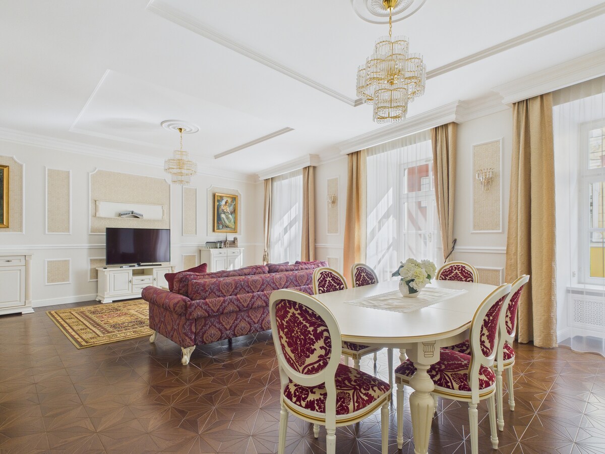 This two-bedroom apartment in Riga’s Old Town offers a refined take on classic luxury, with elegant finishes, soft tones, and thoughtful design throughout. Crystal chandeliers, patterned floors, and timeless furnishings create a calm, romantic atmosphere. The layout balances privacy and shared space, with two bedrooms, two bathrooms, and an open-plan living area. Set on one of the Old Town’s key streets, the location is both central and convenient.