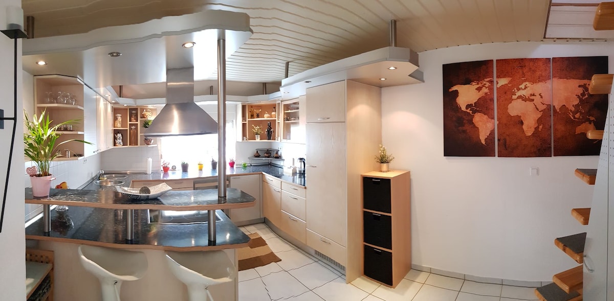 附屬公寓就位於我們的獨立屋內,並設有獨立入口,穿過我們的地下室即可進入。 多虧了上油的木地板,這間公寓既明亮又非常迷人。 如果你和我們一樣樂於看到花園的景觀、貓咪在周圍悄悄走動和3隻雞咯咯叫,那麼你來對地方了。 我們是一個家庭,有3個年長的孩子,期待友好的相遇,並希望讓您在海爾布隆的住宿愉快。