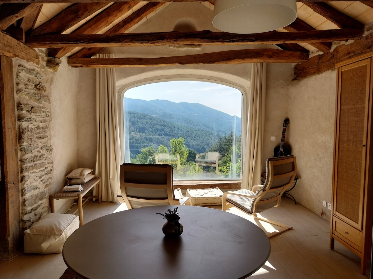 這間迷人的單間公寓位於南阿爾代什的中心,景色宜人。美麗的古老氛圍,舒適和美麗的景色!一個小小的天堂角落。 早晨,你會被綿羊的鈴聲和快樂的燕子喚醒。讓自己被綠色的山丘和山脈所擁抱!無論您是選擇悠閒地放鬆還是積極地外出,您都可以在這裡找到充電的寧靜。單間公寓距離瓦爾萊班的溫泉僅10分鐘車程。