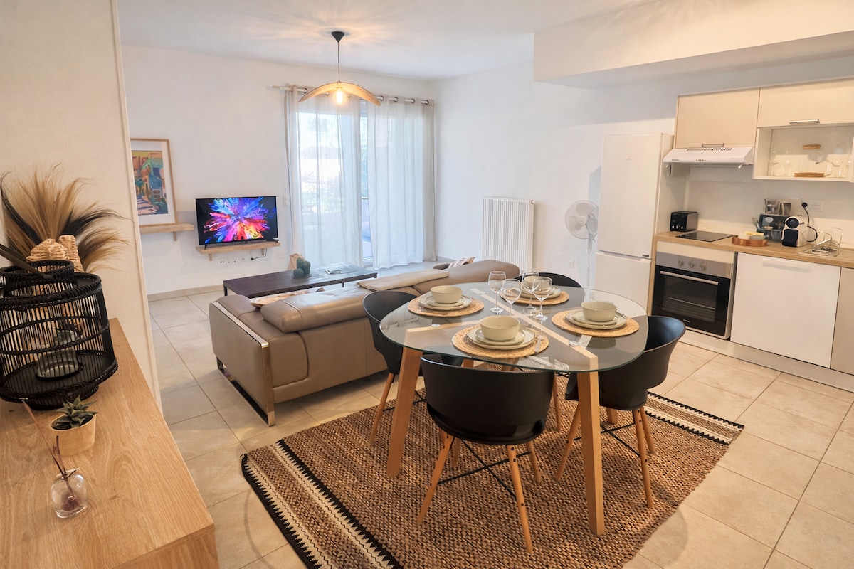 安靜的單間公寓,配有獨立的小型私人花園。 公寓經過全面翻新,配備所有必要的舒適設施。獨立出入口。位於非常安靜的區域,距離高速公路 10 分鐘,距離蒙彼利埃 15 分鐘,距離海邊 25 分鐘。